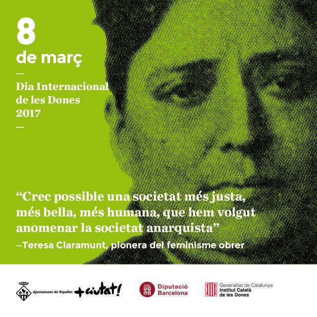 Com no pot ser d'altra forma, la dona protagonitza totes aquestes activitats des de punts de vista molt diversos: lluitant per la igualtat, contra els tòpics i estereotips, a favor de la diversitat i dones fent història. Enguany, també la imatge d'aquesta diada commemorativa ha volgut ser reivindicativa. Les encarregades de recordar-nos que s'ha de continuar lluitant per la igualtat són Montserrat Roig, Neus Català, Federica Montseny i Teresa Claramunt. Tots els actes estan oberts al públic en general i no cal inscripció prèvia, llevat del sopar-debat del dia 11 de març que requereix reserva.
