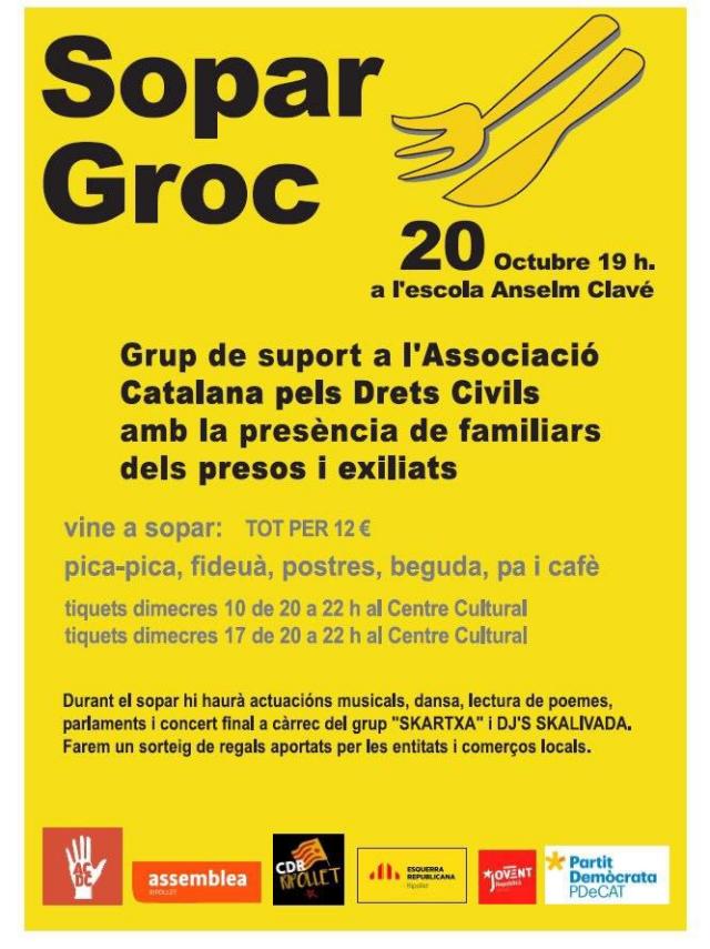 Auqest dissabte, 20 d'octubre, l'Associació Catalana pels Drets Civils organitza un sopar groc solidari al pati de l'escola Anselm Clavé. L'acte es farà de les 19 a les 21.30 h, i comptarà amn la presència de la presidenta de l'ACDC, Meritxell Lluís, i Xavier Sánchez, ambdós representants dels familiars dels presos i exiliats. Després de l'acte, es farà un concert a càrrec de grups locals i un sorteig amb participació solidària. Hi seran presents familiars d'alguns presos o exiliats relacionats amb el procés independentista català. Totes les persones que participen a l'acte ho fan a títol individual.
