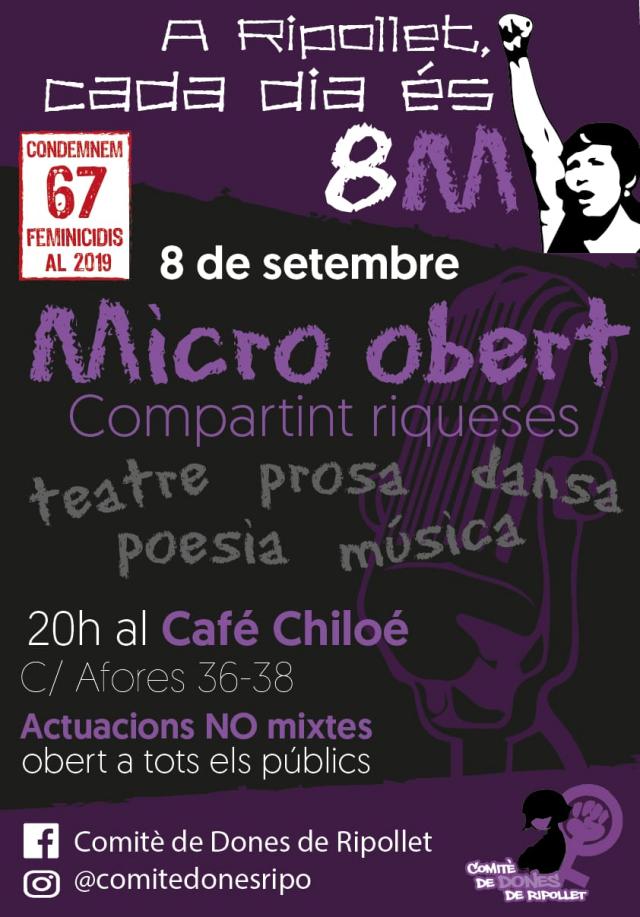 El Comitè de Dones de Ripollet organtiza un micro obert feminista, dins la campanya "Cada dia és 8M!" que celebra els dies 8 de cada mes de l'any. Serà a les 20 h al Cafè Chiloé (c/ Afores, 36-38), amb actuacions no mixtes, però l'acte és obert a tots els públics.