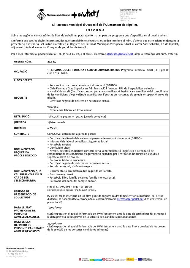 Oferta 1 persona docent d'oficina i serveis administratius