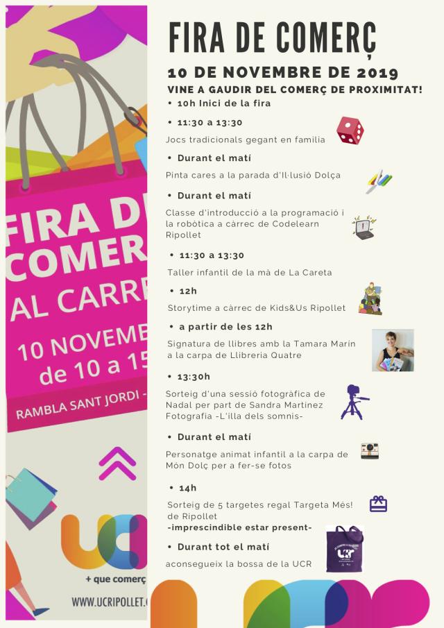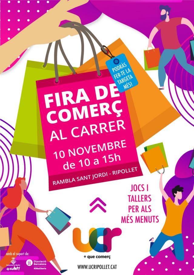 La Fira de Comerç de l'UCR prendrà la rambla de Sant Jordi, a l'alçada del Centre Cultural, aquest diumenge, en un matí ple d'activitats i botigues al carrer. A partir de les 10 i fins les 15 h, els ripolletencs i ripolletenques tindran l'oportunitat de comprar mentre participen de tot d'actes i tallers, a més d'aconseguir la bossa de l'UCR i participar en el sorteig de cinc targetes Més i moltes altres sorpreses!