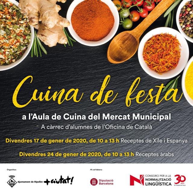 Taller de cuina amb els alumnes de l'Oficina del Català, amb qui descobrirem receptes d'arreu del món. Al taller del divendres 17, receptes de Xile i Espanya. A l'Aula de Cuina del Mercat Municipal.