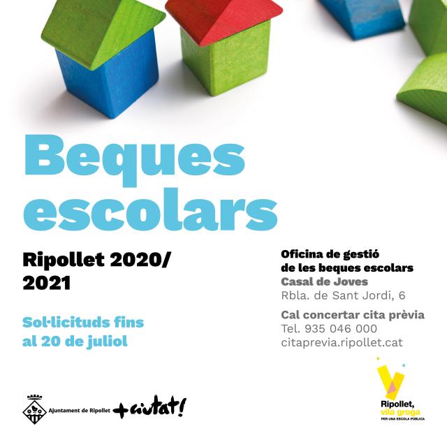 A partir del 26 de maig i fins al 20 de juliol es poden tramitar les sol·licituds de beques escolars de menjador i de llibres i material escolar per al curs 2020-2021. Poden optar-hi les famílies dels alumnes empadronats a Ripollet que cursin de P3 a 4t d'ESO en un centre educatiu del Vallès Occidental. La presentació de sol·licituds es realitzarà, prioritàriament, de forma telemàtica, tot i que també s'ha habilitat un punt d'atenció presencial, amb cita prèvia.