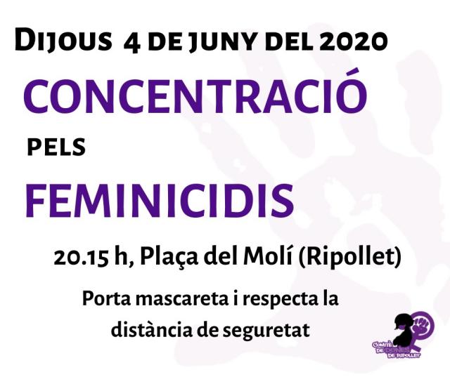El Comitè de Dones de Ripollet reprèn les concentracions de cada primer dijous de mes, aquest 4 de juny, a les 20.15 h, a la plaça del Molí, contra els feminicidis i també la violència racista viscuda recentment als Estats Units. L'espai estarà marcat per facilitar que les persones assistents mantinguin les distàncies. També es vigilarà l'aforament i que tothom porti la mascareta obligatòria.
