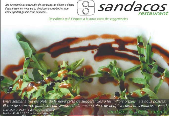 | Descripció | Per què es va fer aquest equipament?. Desprès de les inundacions del 1962, el masover de Can Buxó, el difunt Rosito, va anar-se’n a lloc més segur, quedant els Horts Tancats de Can Buxó, com un enorme ermot a l’entrada del poble. La señora Josefa Trosses Vdua. De Gassó, propietària del lloc, va decidir què allí davant de casa hi volia fer quelcom què no perdés la vista de la carretera i que la gent des de la carretera no perdés de vista aquella casa referent durant segles de Ripollet. Per què tennis i restaurant?. Després de varies propostes del grup de treball, algunes més lucratives, va decidir fer, quelcom innovador al poble, dues pistes de tennis de terra batuda (era una instal·lació que permetia les vistes) i al costat dret, per tal de donar servei als usuaris d’aquestes i a qui volgués, s’hi va aixecar una construcció per ser bar-cafeteria. Per què aquest nom?. La Señora Trosses, va voler que qui explotés aquest complex fos una persona aliena a la casa i entesa en el servei, així què fou el propi constructor que va presentar-li als primers llogaters. Eren dos cosins de Castella, el més conegut al poble, en Resti, i foren ells qui varen donar nom al lloc. Va ser pujant les escales de la casa, a on hi ha un mural de rajoles decorades obra del monjo-artista del Monestir de Montserrat, el pare Josep Maria, Joan Gassó i Buxó, fill del Doctor Josep Gassó i Vidal i de la señora Encarnación Buxó i Torras, i per tant, cunyat de Senyora Trosses. El cosí d’en Resti, va veure e quadre quan anava a signar el contracte d’arrendament, i tot jugant amb els noms dels dos Sants que hi apareixien, San Damià i San Cosme, va fer el nom: SAN-DA-COS. Qui ha passat pel lloc en aquests 32 anys d’existència?. Aquells cosins, varen durar poc temps, sis mesos. El tennis no era per ells, i sí el restaurant, que anava tan bé com volien, però no s’entengueren ambdós i van plegar. Sandacos va quedar tancat un parell de mesos, fins que la gent del poble va demanar a la Sra. Trosses que obrís per gaudir d’aquell espai nou. Ho van fer les pistes, amb els seus tres fills al capdavant, primer, afegint-s’hi el seu germà en Víctor Trosses, per acabar, amb els anys, gestionant-lo en solitari el seu fill gran, en Pius Gassó, fins avui. Amb el restaurant no s’hi van atrevir i per això el va llogar fins a quatre vegades més. La darrera es va obrir com marisqueria, 15 anys. Acabat el contracte del darrer llogater, varen decidir dos dels fills de la senyora, arrencar-lo novament ells dos amb l’aixopluc de l’empresa familiar què tenen. Després d’un any i mig d’obres per l’adaptació a les noves normatives, es va obrir a mitjans de l’any 2005, amb una renovació total del local, de l'indret i sobre tot de tipus de menjar. Perquè el canvi d'orientació? Ens va semblar què calia donar un nou caire al restaurant desprès de l’anterior tipus de cuina. Vàrem pensar en la cuina mediterrània, a base d’amanides i carns nostres, i les pastes i les delicioses pizzes italianes fetes al tradicional forn de llenya. Oferim aquells plats i a més, cal esmentar a part, les postres, i en especial els casolans, la pannacotta i el Tiramisú, típics italians. A més, a Sandacos podeu gaudir de reposteria siciliana, novetat a l’estat espanyol en la que hem estat promotors i pioners: cannollo siciliano, cassata... Deixem a la inventiva dels nostres cuiners altres postres de caire modern, a més dels menys sofisticats, què no menys deliciosos, flam, arròs amb llet, macedònia de fruita... |